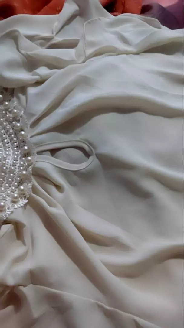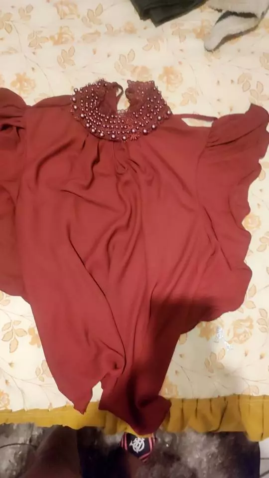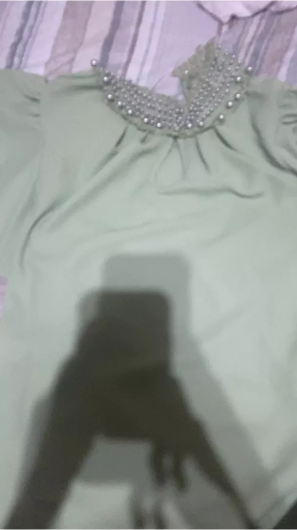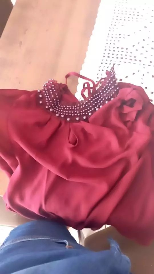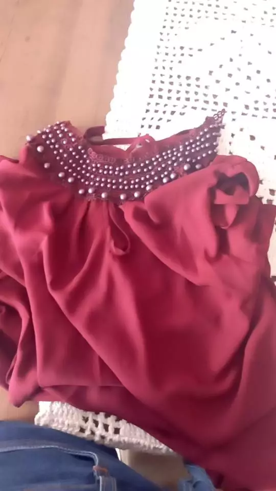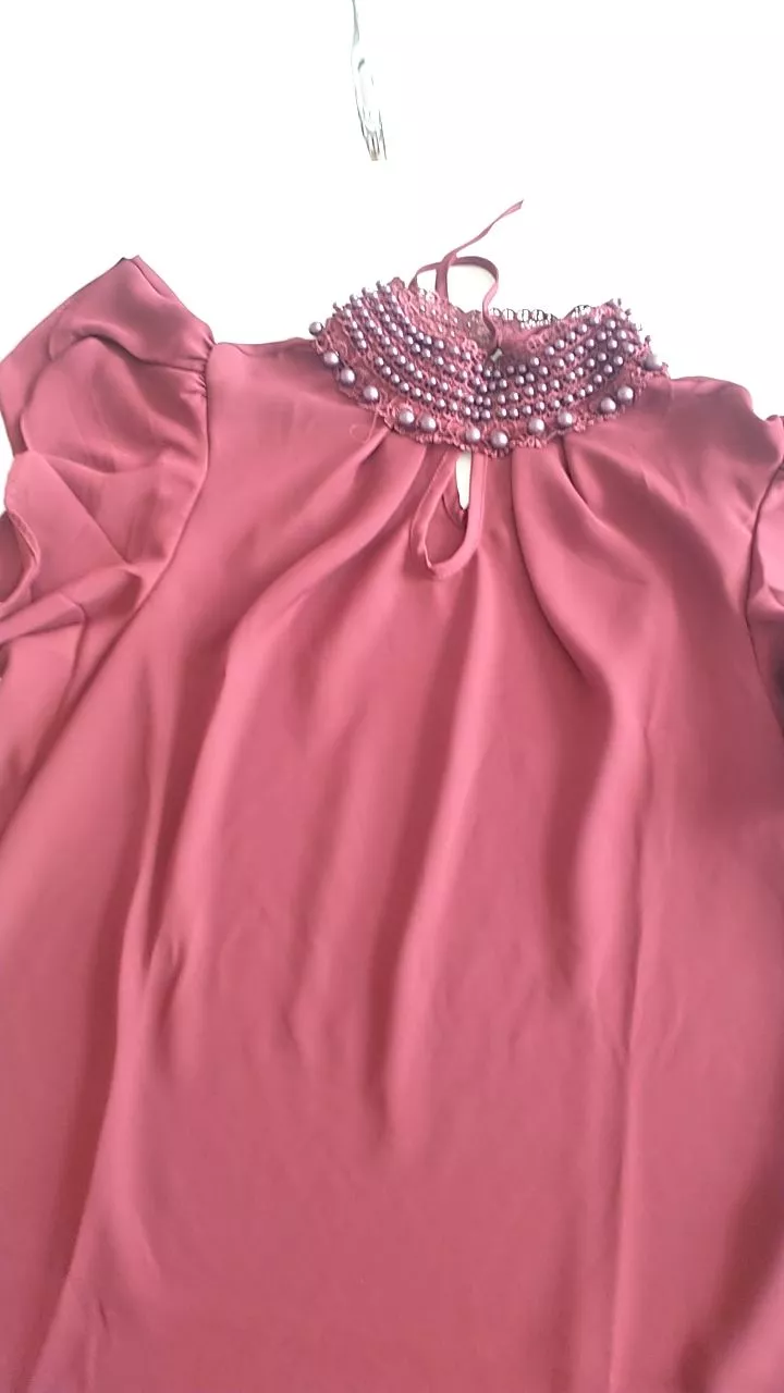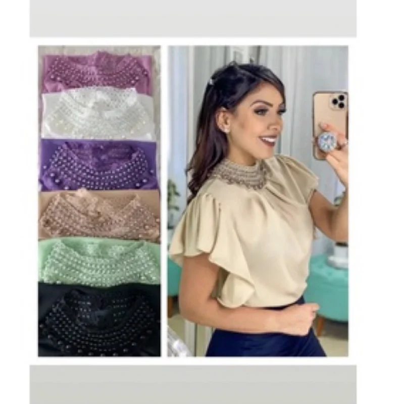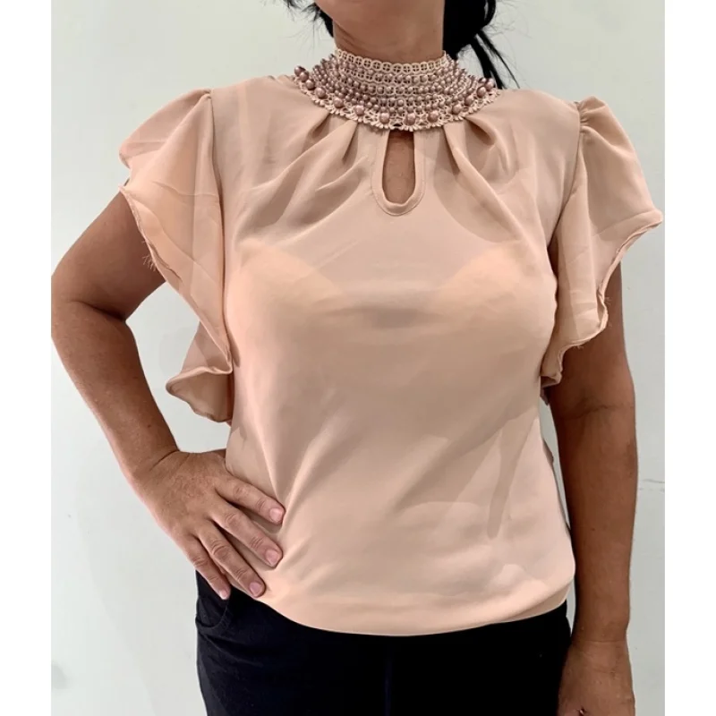Compre a elegante blusa social de moda feminina com babado de manga curta e detalhes em pérolas no pescoço na loja online da Raryel. Aproveite nossos preços baixos, promoções e descontos exclusivos!
