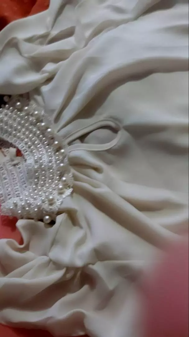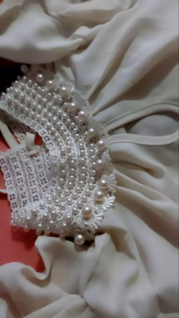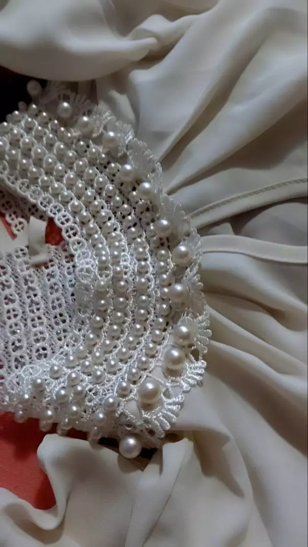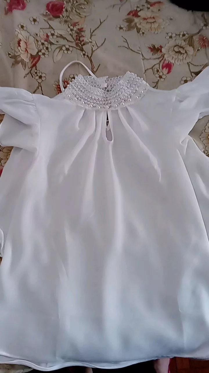 Moda feminina: blusa social com babado de manga curta e pérolas no pescoço - Branco