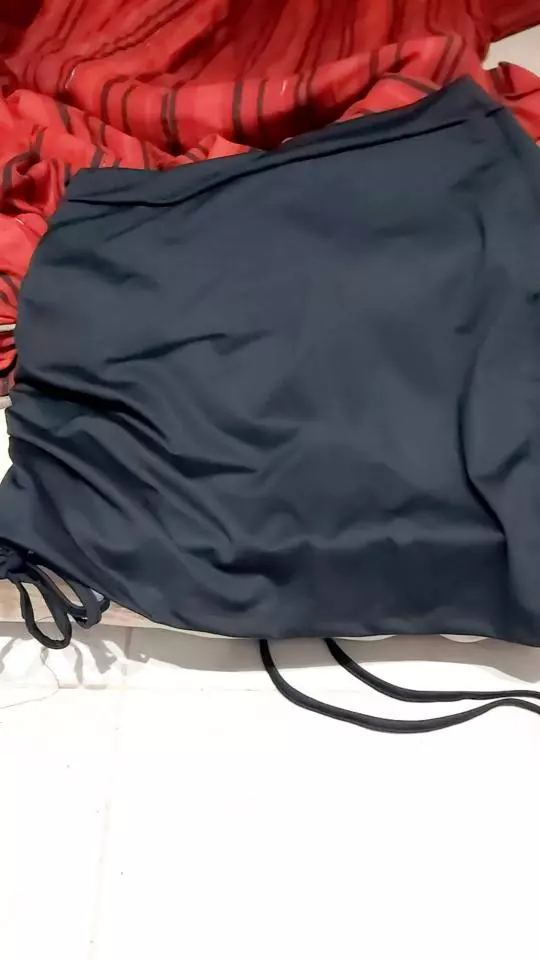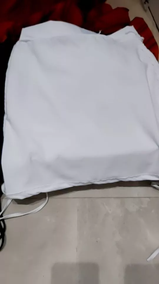 O drapeado fica do lado direito e pode ser ajustado tanto para encurtar quanto para alongar