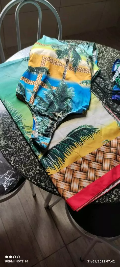 Os conjuntos de maiô com pareô em formato quadrado são fabricados em suplex digital