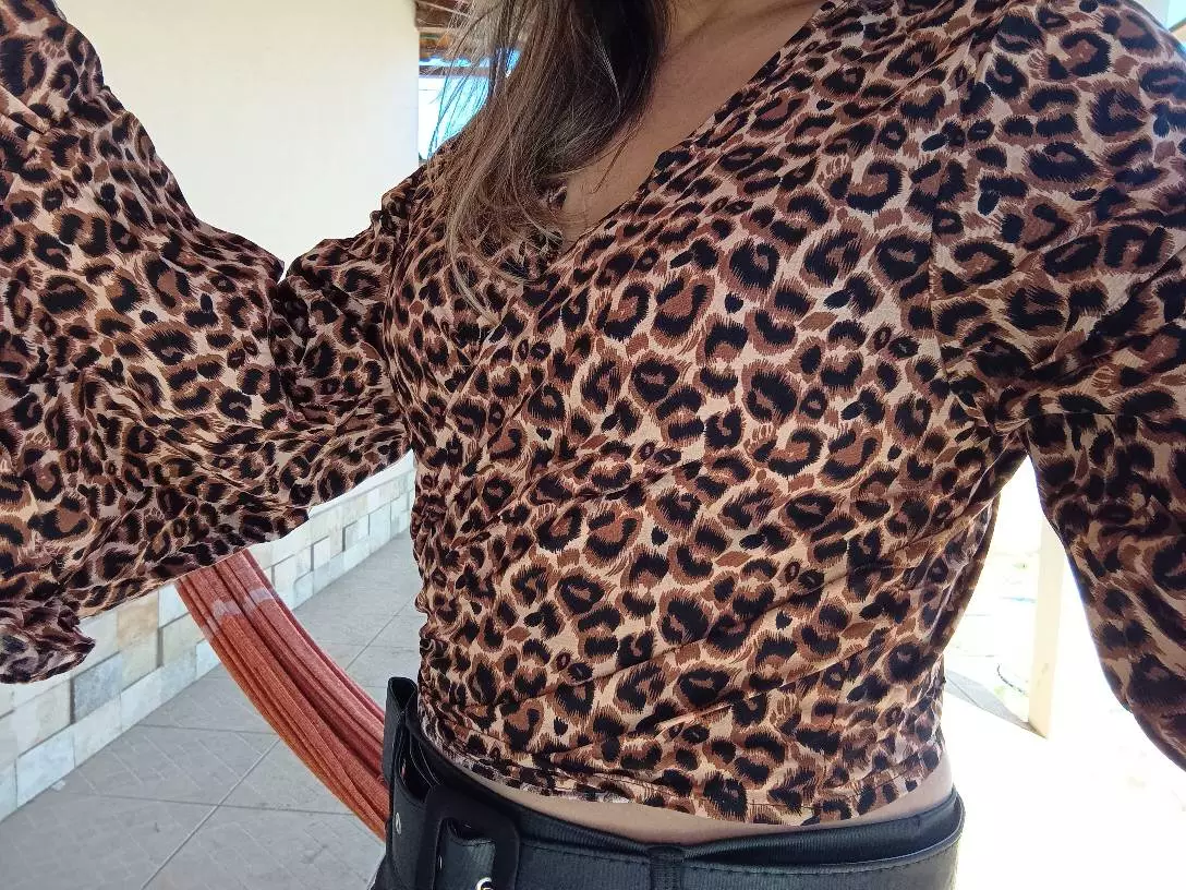 Compre a Blusa Feminina Cropped Manga Longa Flare com babado e amarração na frente/costa. Perfeita para o verão, com estampa de onça. Aproveite os preços baixos e promoções na loja online de roupas Raryel.