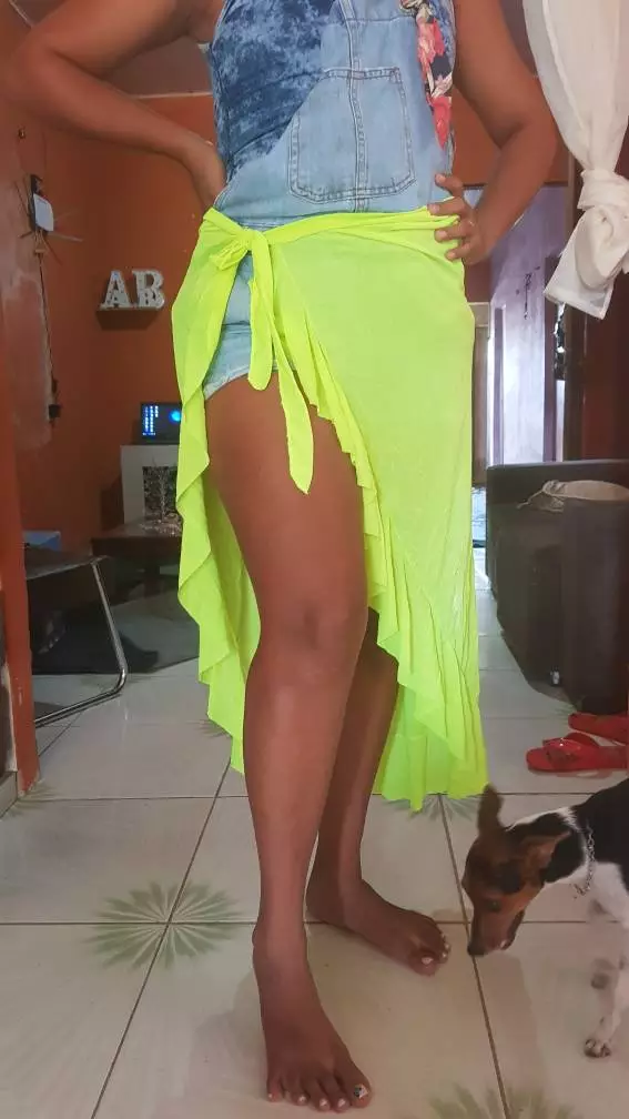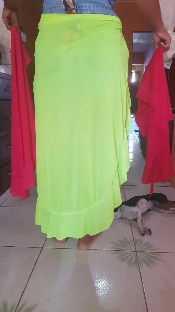 Saia modelo trasnpassada mais conhecida como pareo Detalhe de babado na parte de baixo e na frente da saida