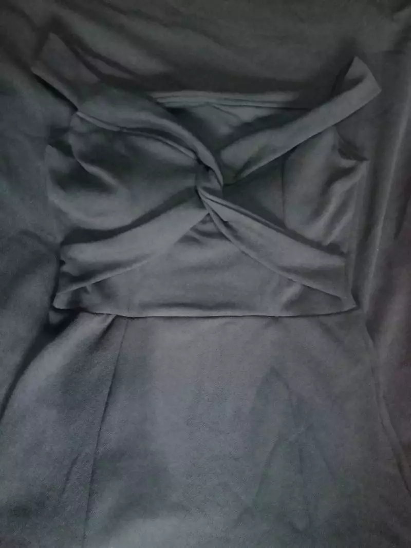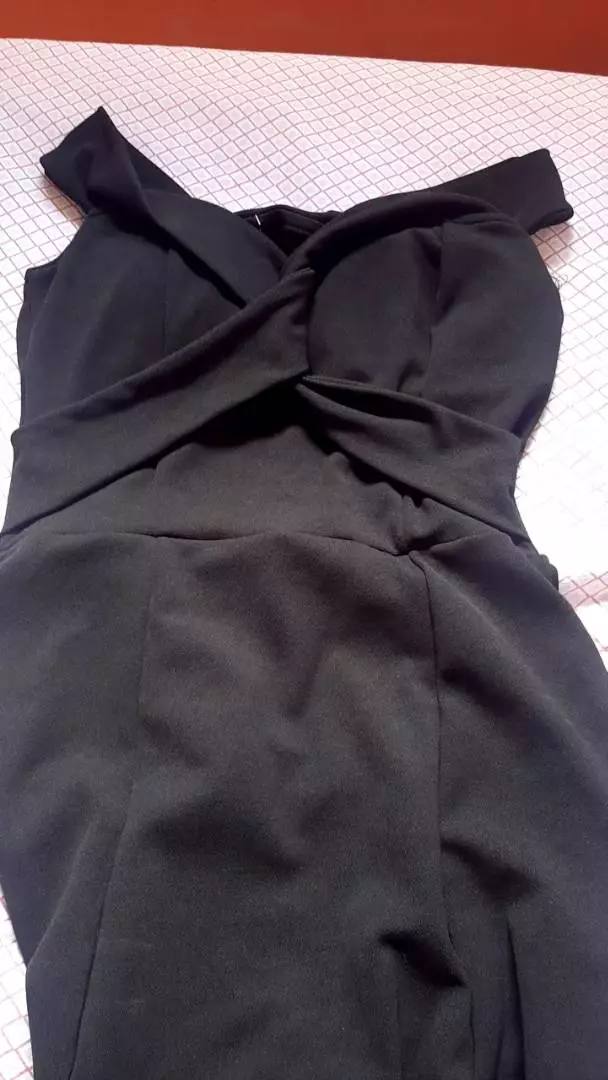 Vestido modelo ombro a ombro com detalhe cruzado no busto e com fenda