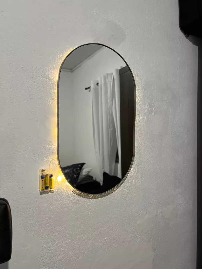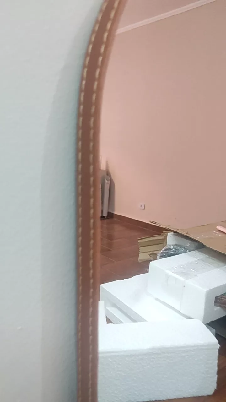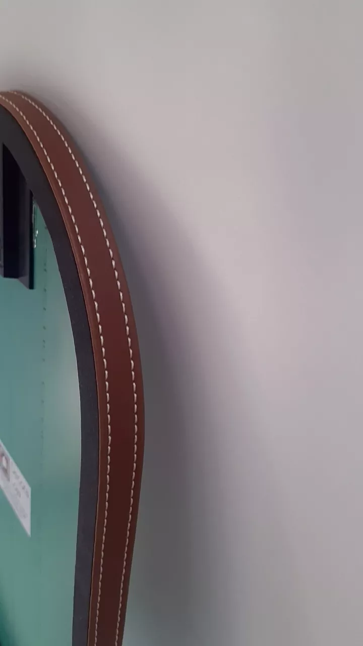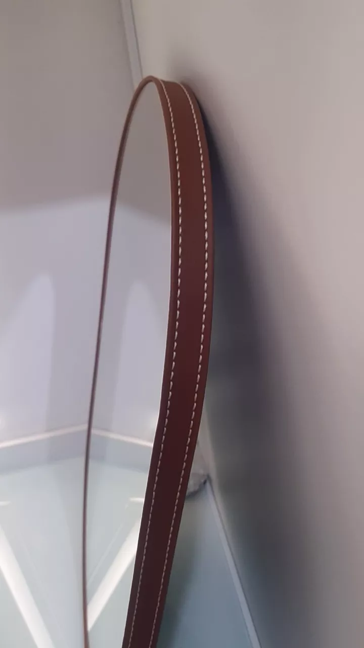 ITENS INCLUSOS 1 ESPELHO DECORATIVO OVAL COM ACABAMENTO FINO EM COURO SINTÉTICO COM COSTURA
