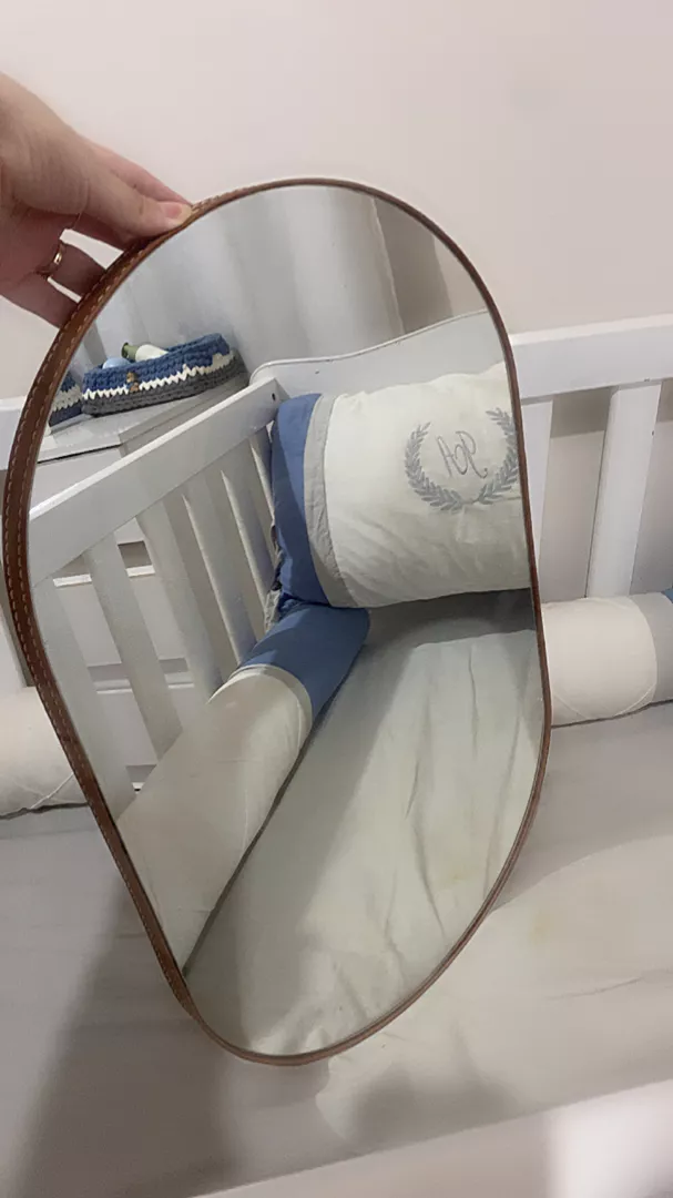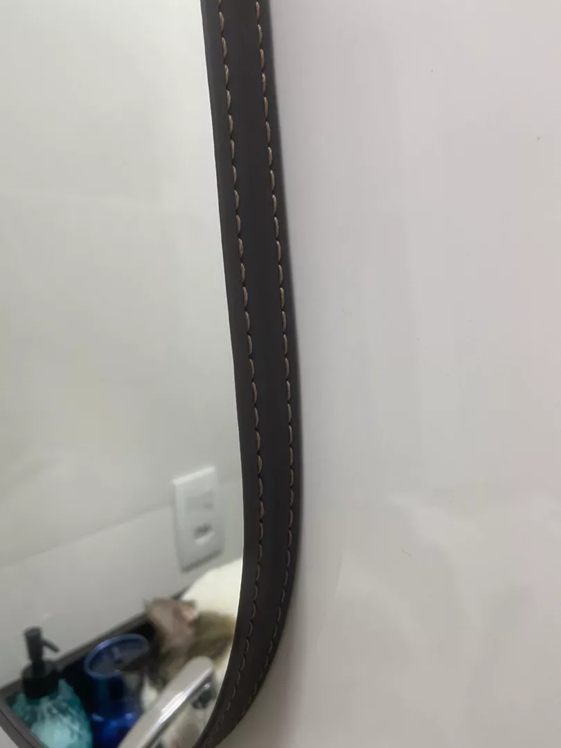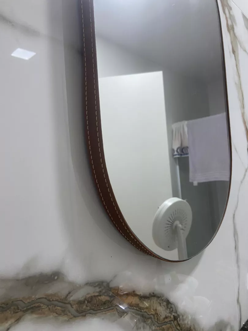 ITENS INCLUSOS 1 ESPELHO DECORATIVO OVAL COM ACABAMENTO FINO EM COURO SINTÉTICO COM COSTURA