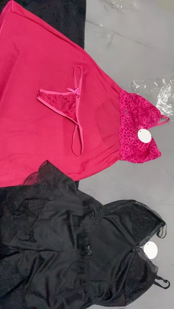 Esse kit é composto por um babydoll e uma camisola com calcinha fio dental
