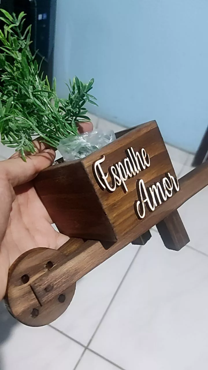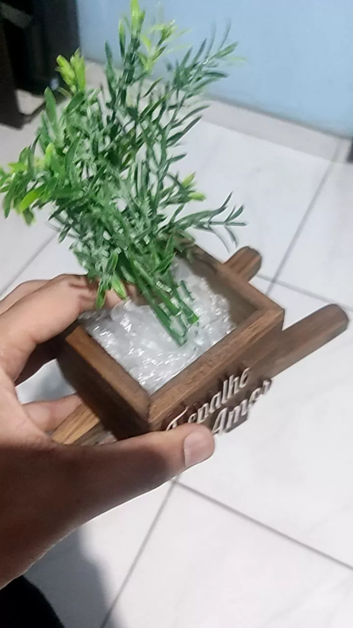 Plantinha artificial em vasinho de madeira estilo carriola - espalhe amor