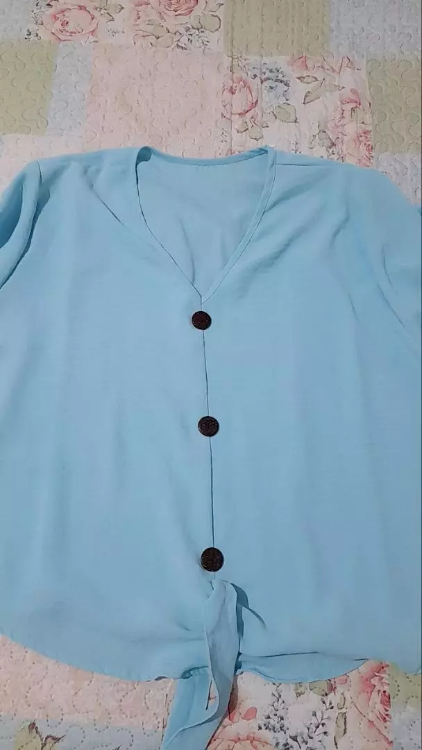 blusa feminina confeccionada no tecido viscolinho com o detalhe do lacinho e botões