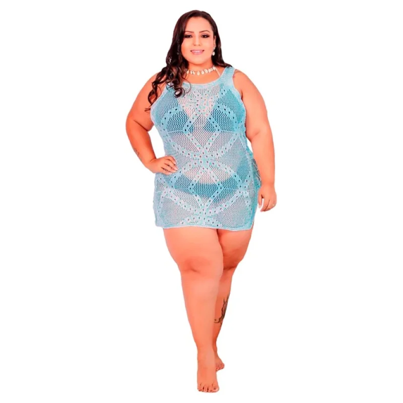 Plus Size Tricot Aberta Praia Detalhe Lateral - Azul