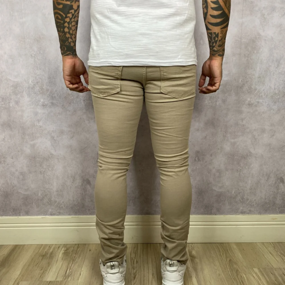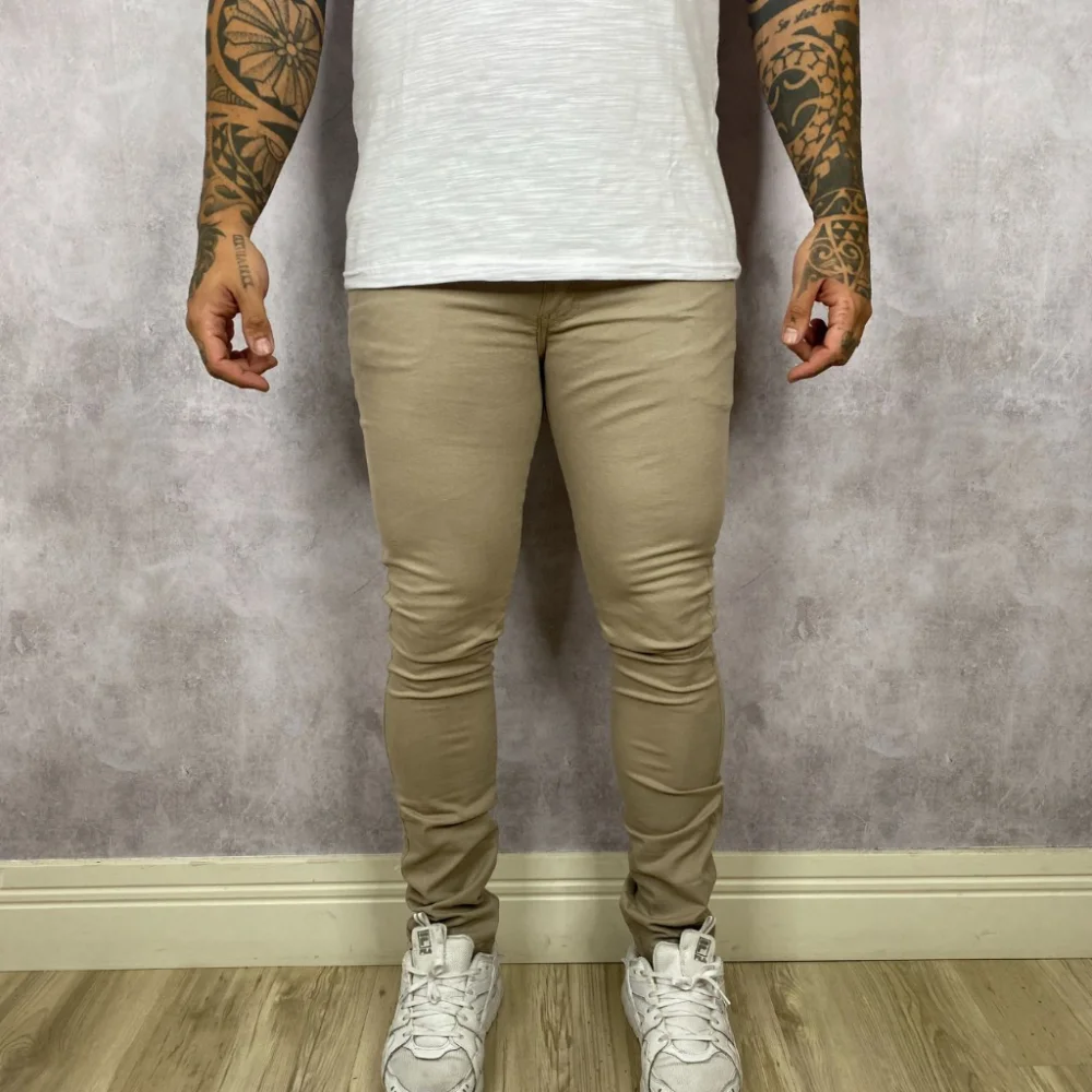Compre a calça masculina skinny de alfaiataria bege premium na loja online Raryel. Aproveite preços baixos, promoções e descontos exclusivos. Perfeita para um visual elegante e sofisticado.