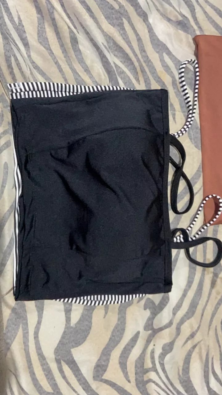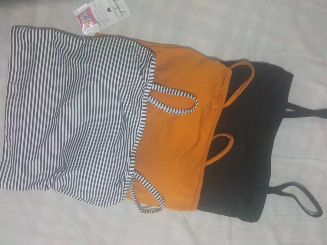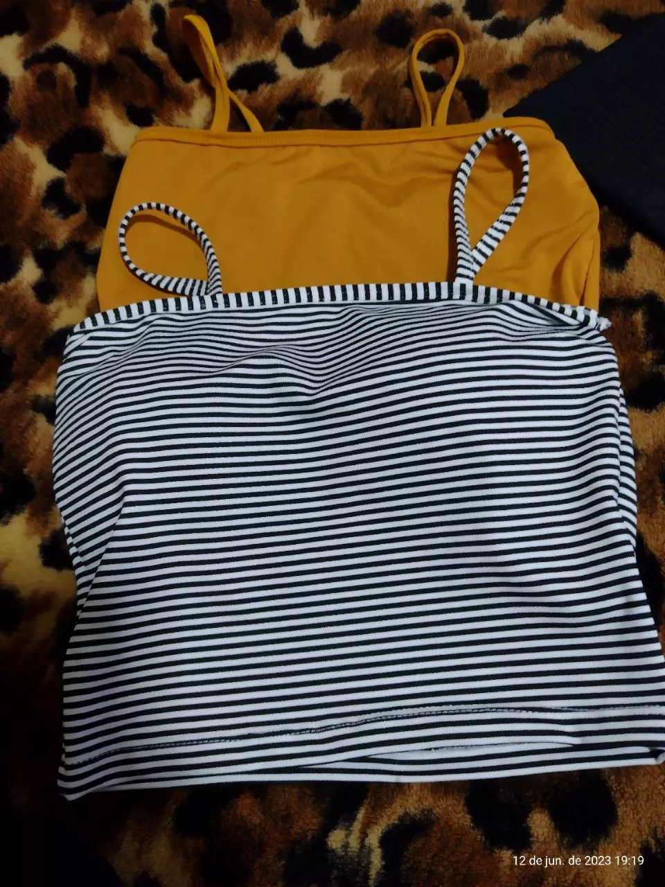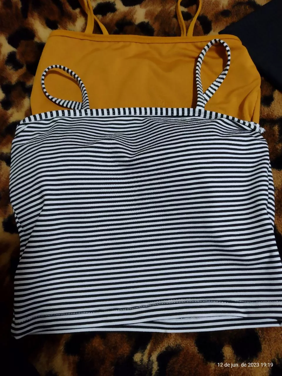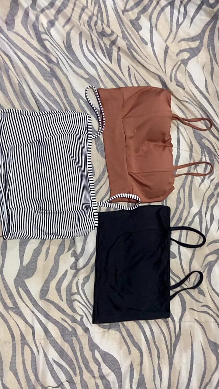 Promoção Blusa Feminina Croped Suplex Reto com Bojo Confortável - Preto/Caramelo/Listrado