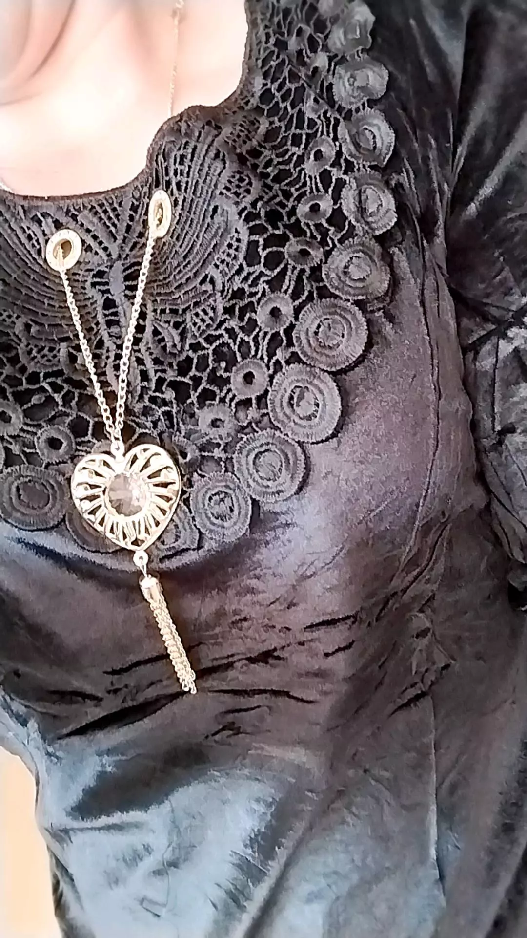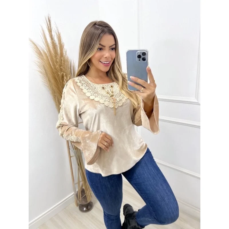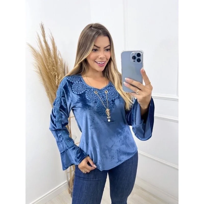 Aproveite a promoção da loja online de roupas Raryel e garanta sua Blusa Veludo Manga Longa com detalhes em renda e colar incluso. Feita com elastano, proporciona conforto e estilo. Preços baixos e descontos imperdíveis!