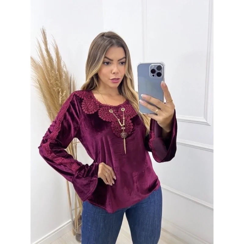 Promoção Blusa Veludo Manga Longa com Renda e Colar - Detalhes Elastano - Vinho