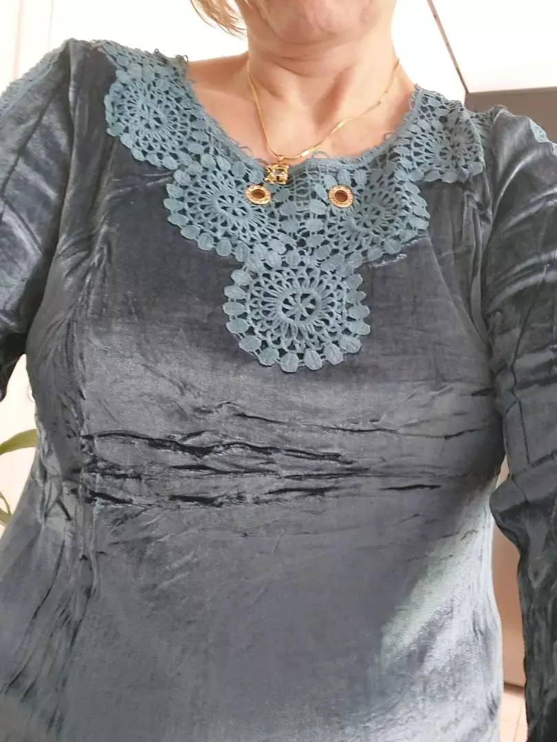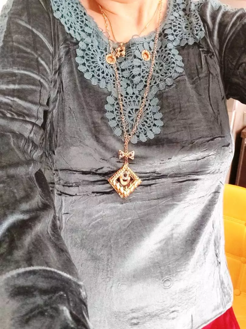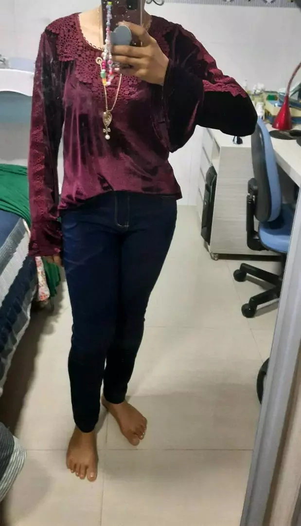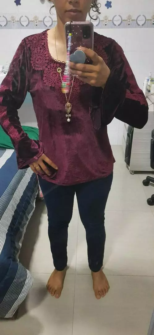 Compre a Blusa de Veludo Manga Longa Feminina com Renda Colar Aleatório em promoção na loja online da Raryel. Tecido de veludo com elastano, modelo W2027/2025. Aproveite preços baixos e descontos!