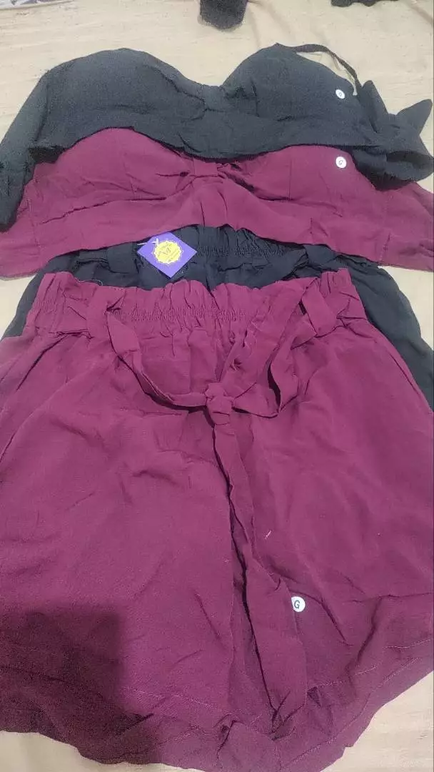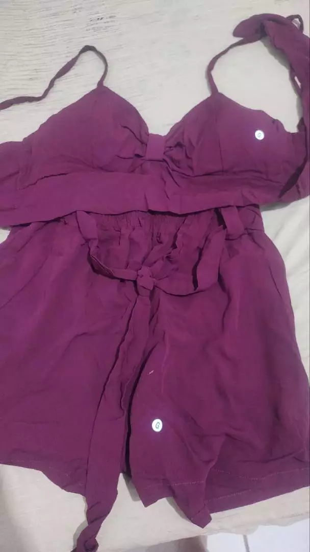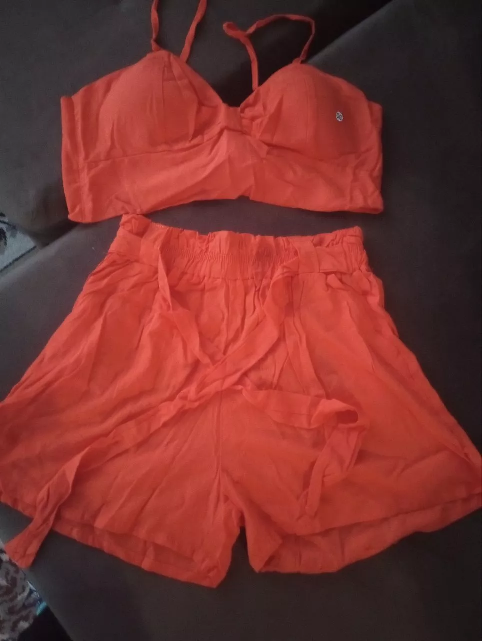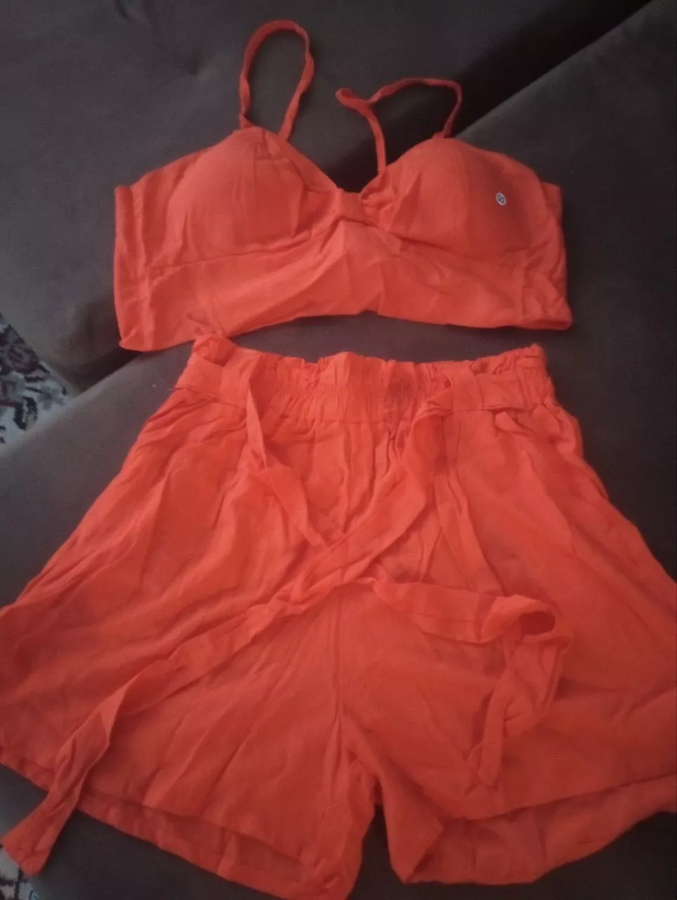 Lindo Conjunto composto por Top Cropped bem acinturado com bojo e ajuste na parte de trás o short possui elastico no cós com fita cinto que vira um laço que da um toque todo especial a peça possui bolsos laterais