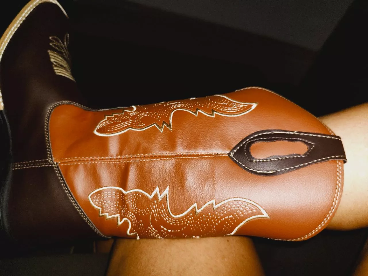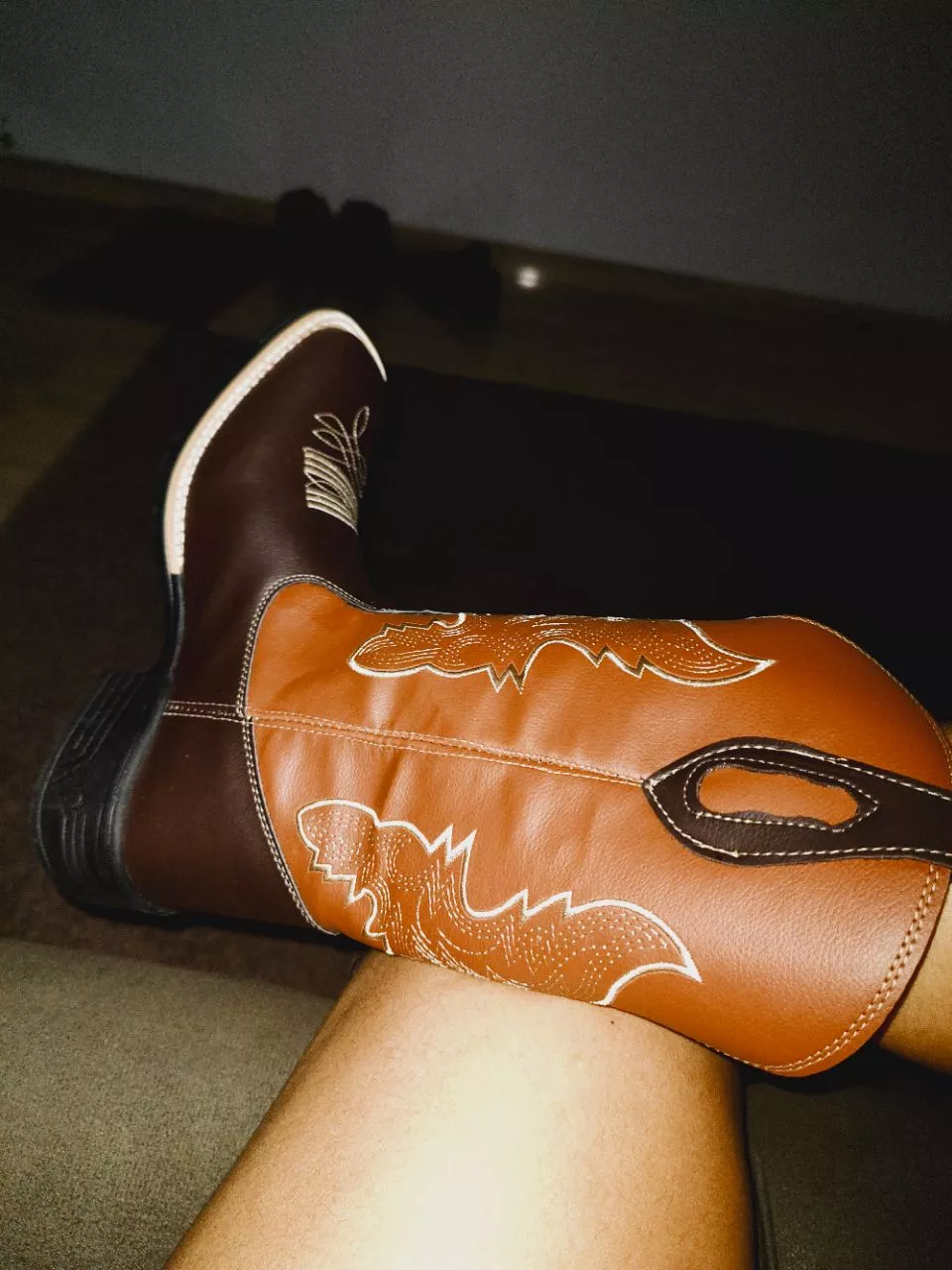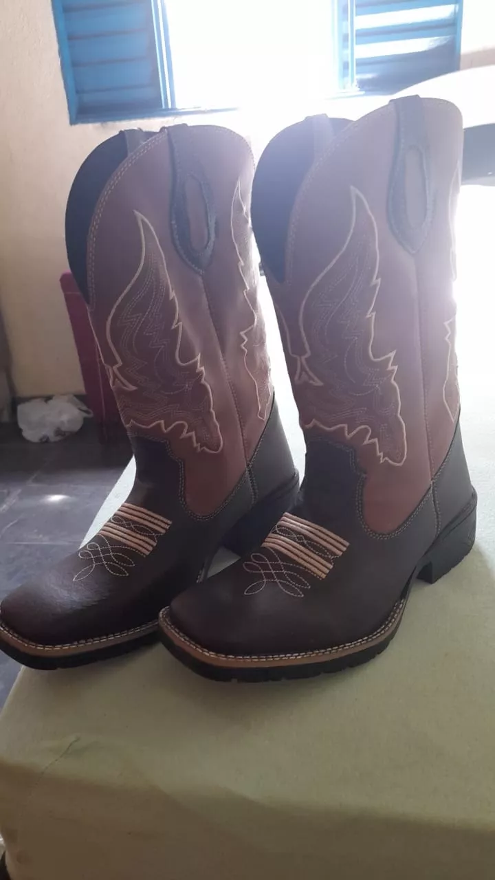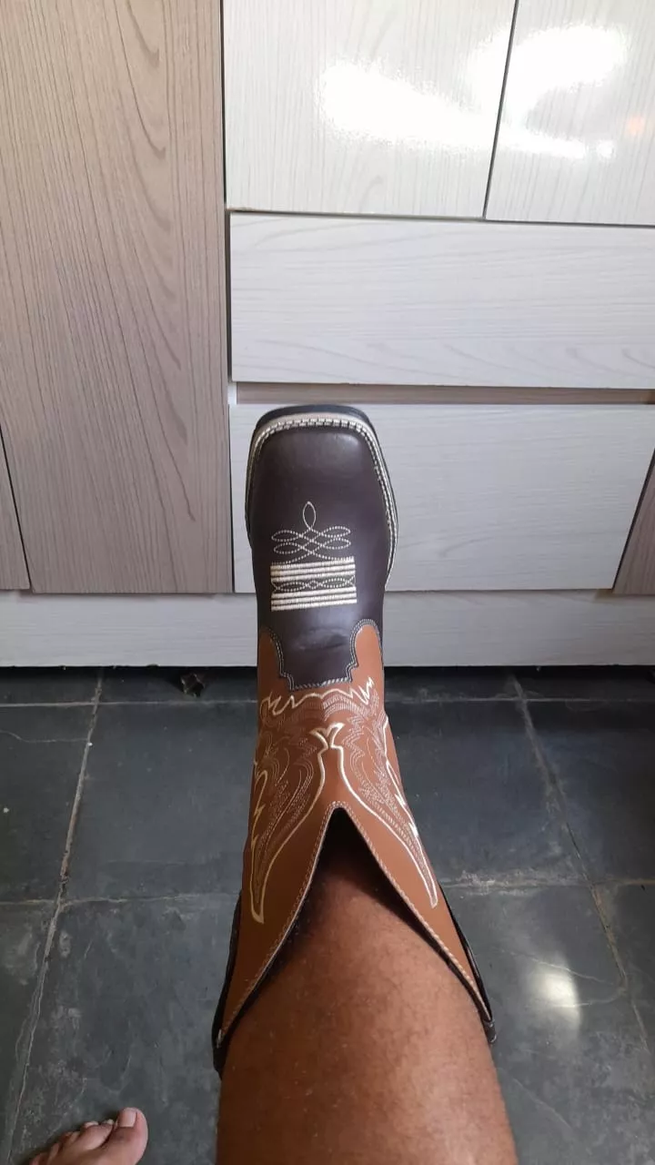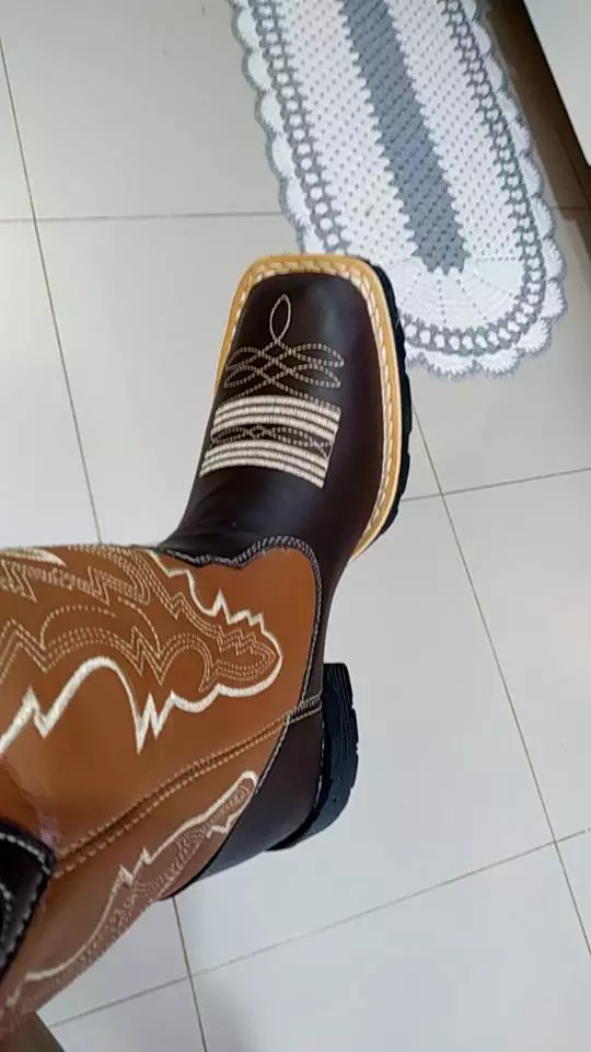 Bota Fontana Boots produzida em alta qualidade extremamente confortável na cor predominante marrom cano preto e bordado cavalo na cor branco