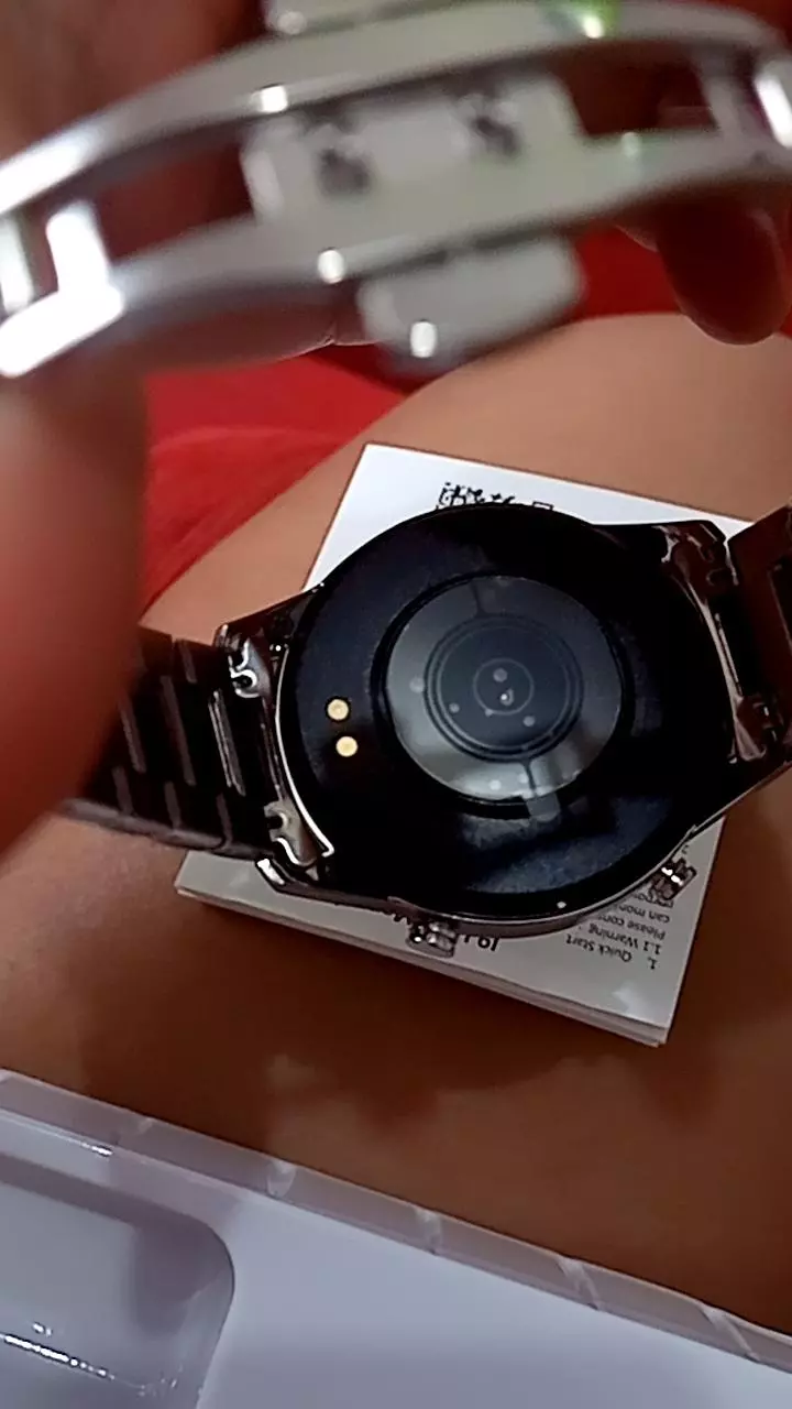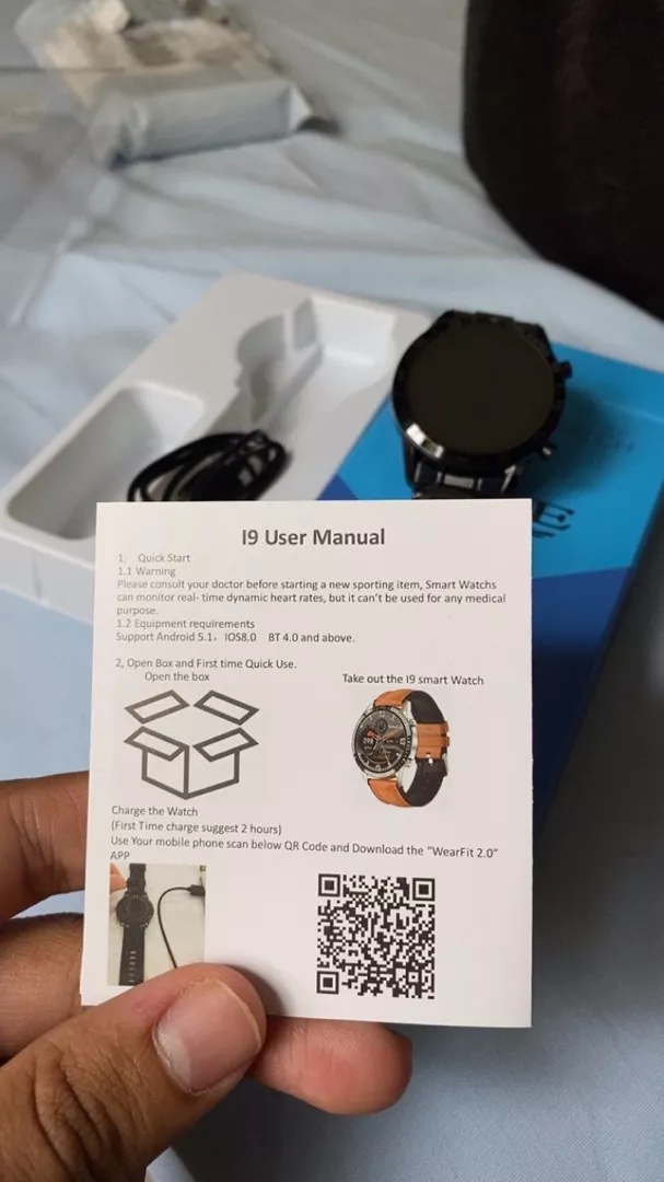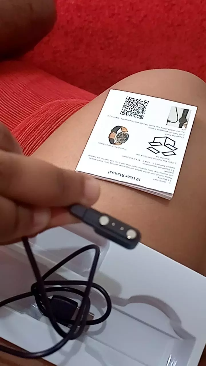 Depois de receber o relógio carregueo primeiro Devido à logística de longo prazo a bateria do relógio é insuficiente Antes de usar escaneie o código QR no manual para baixar o aplicativo e em seguida conecteo ao APP