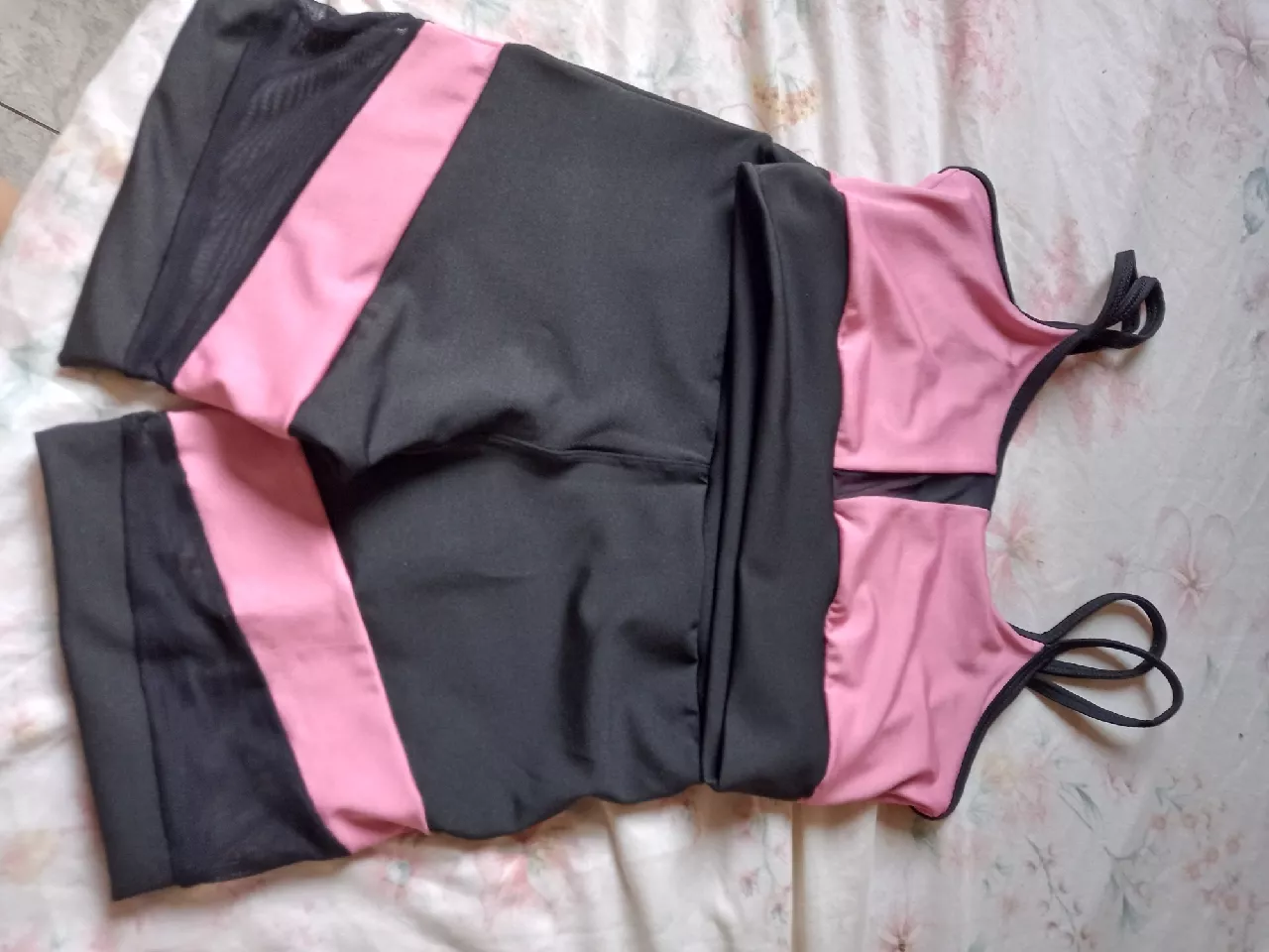 Esse é um conjunto de top com alça dupla sem bojo com detalhe de tela na parte frontal e short legging com detalhe em tela na perna