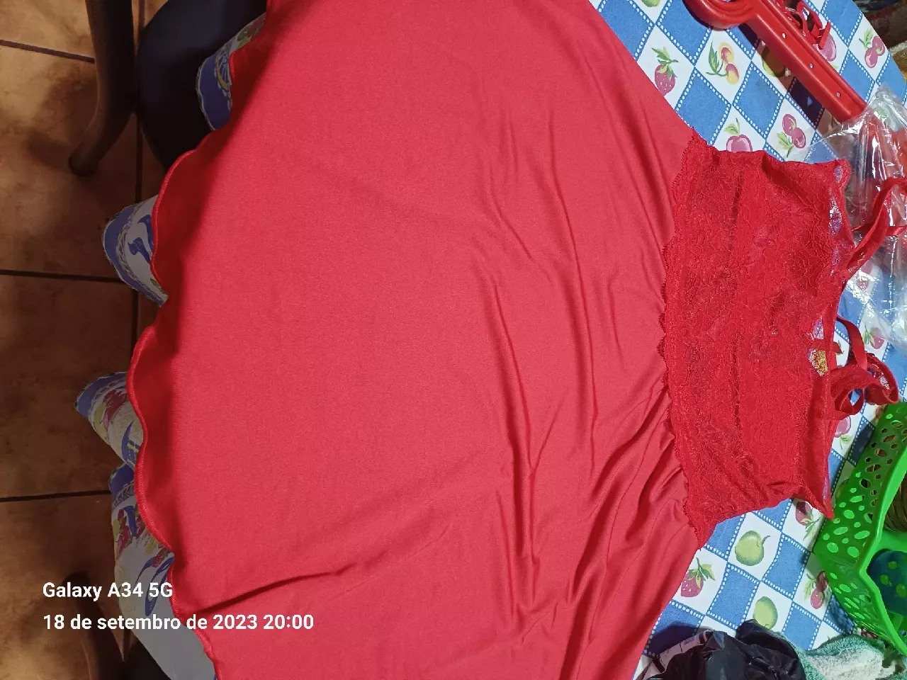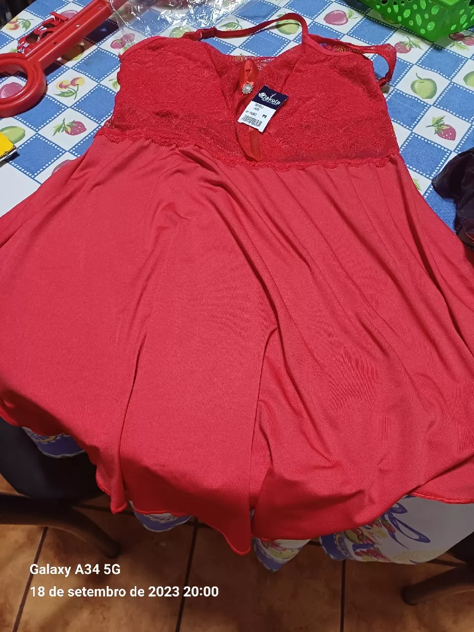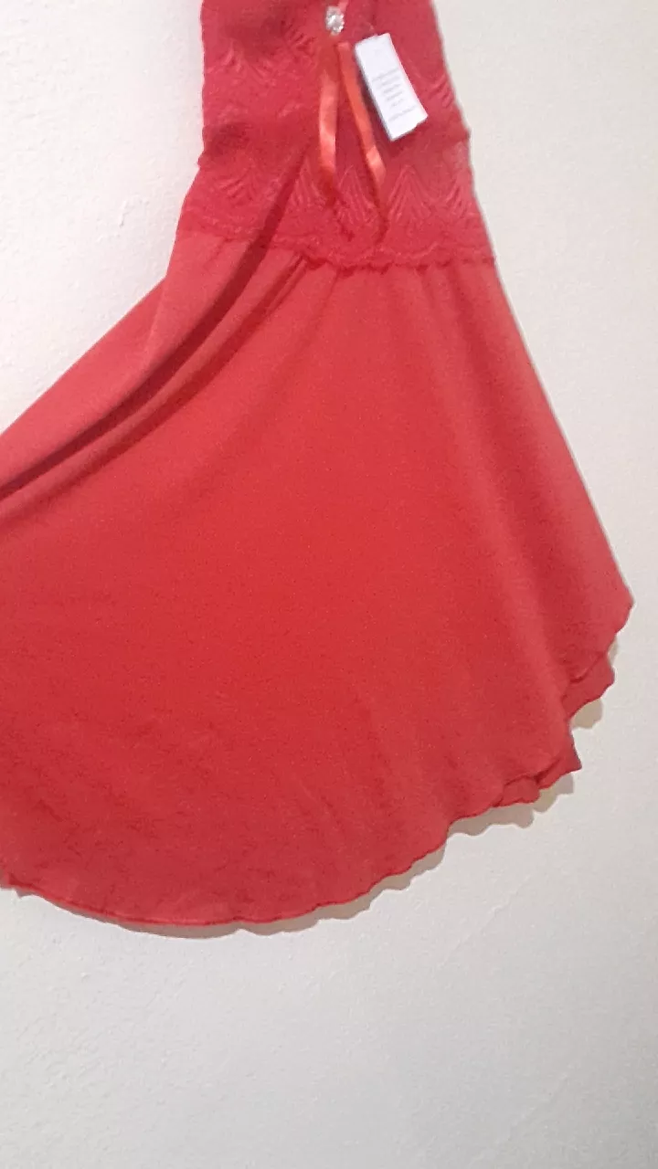 A parte da saia possui modelagem com comprimento menor da parte da frente deixando a camisola com bastante