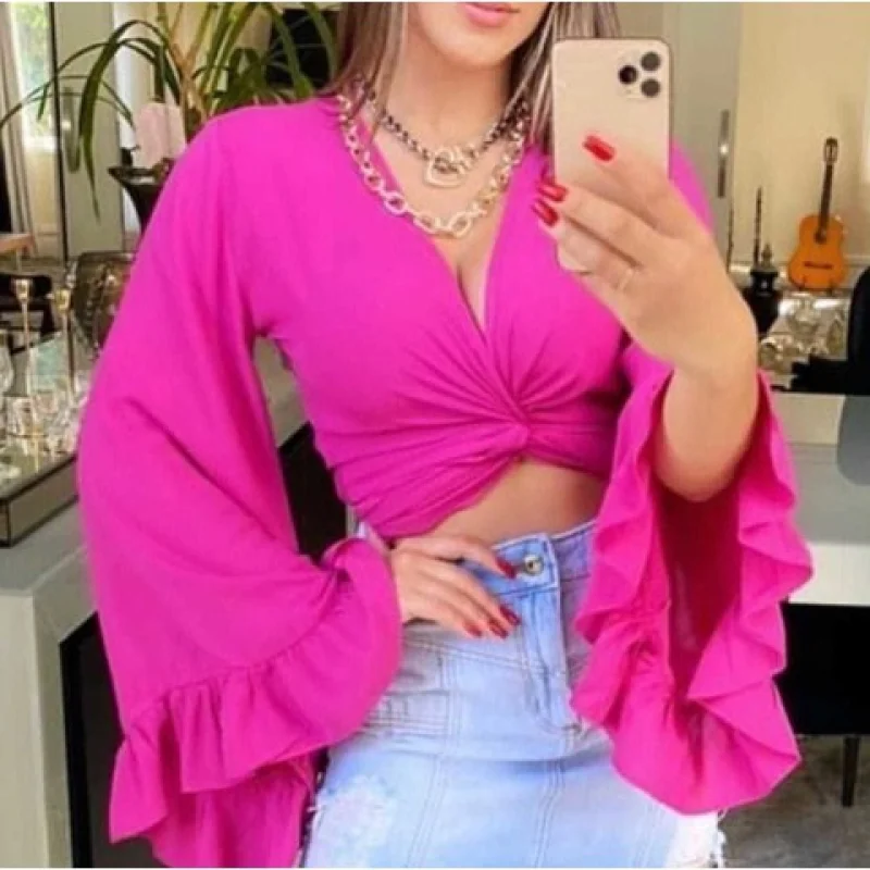 Roupa Feminina Cropped Blusa Manga Flare Babado - Fúcsia