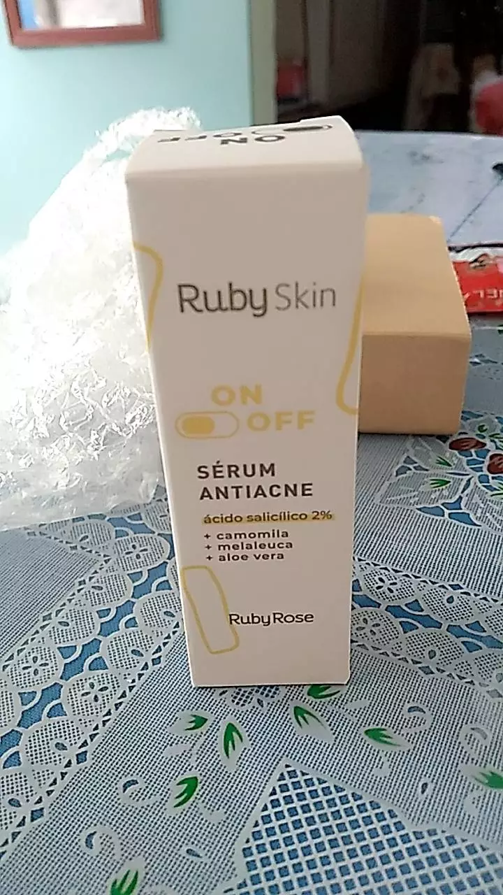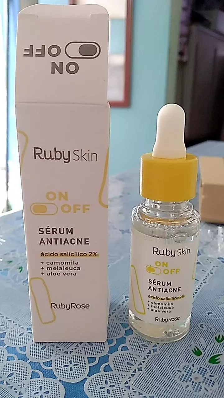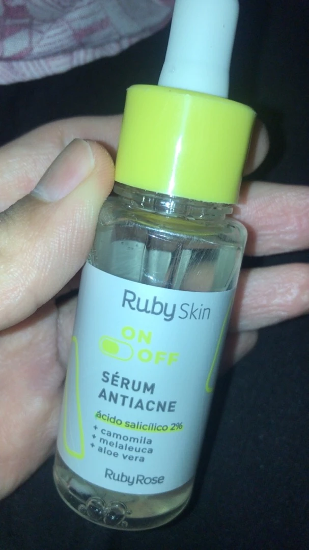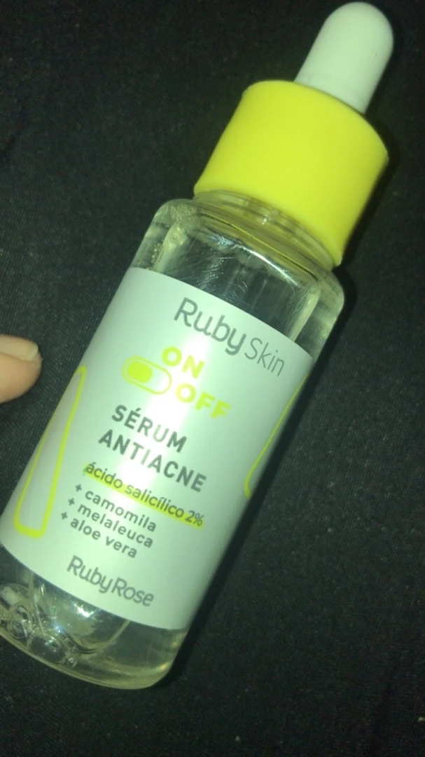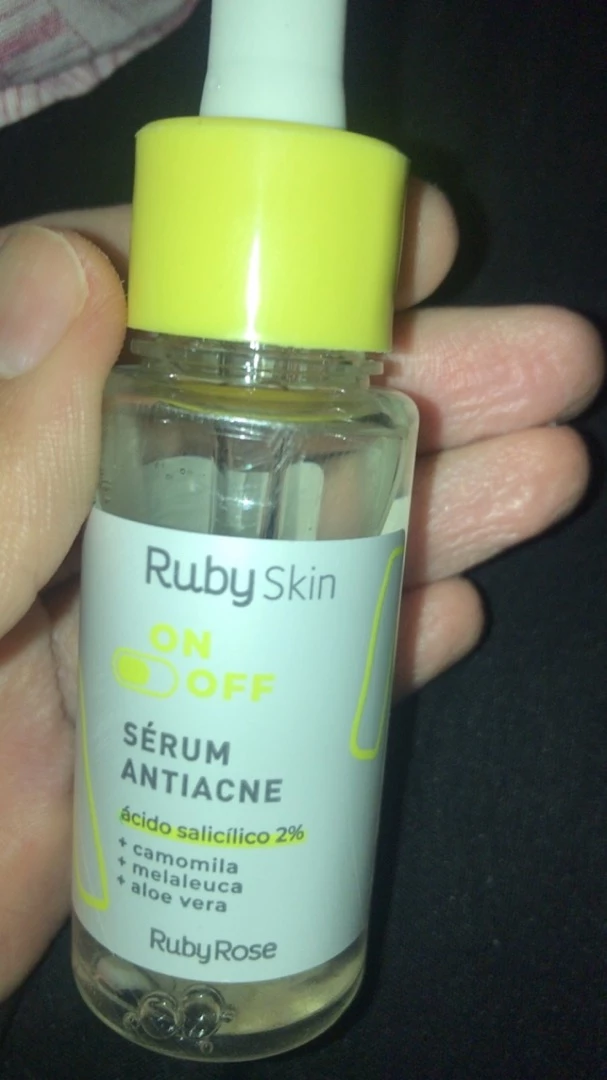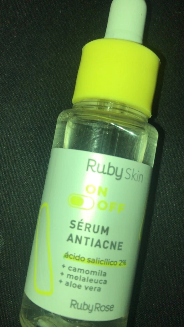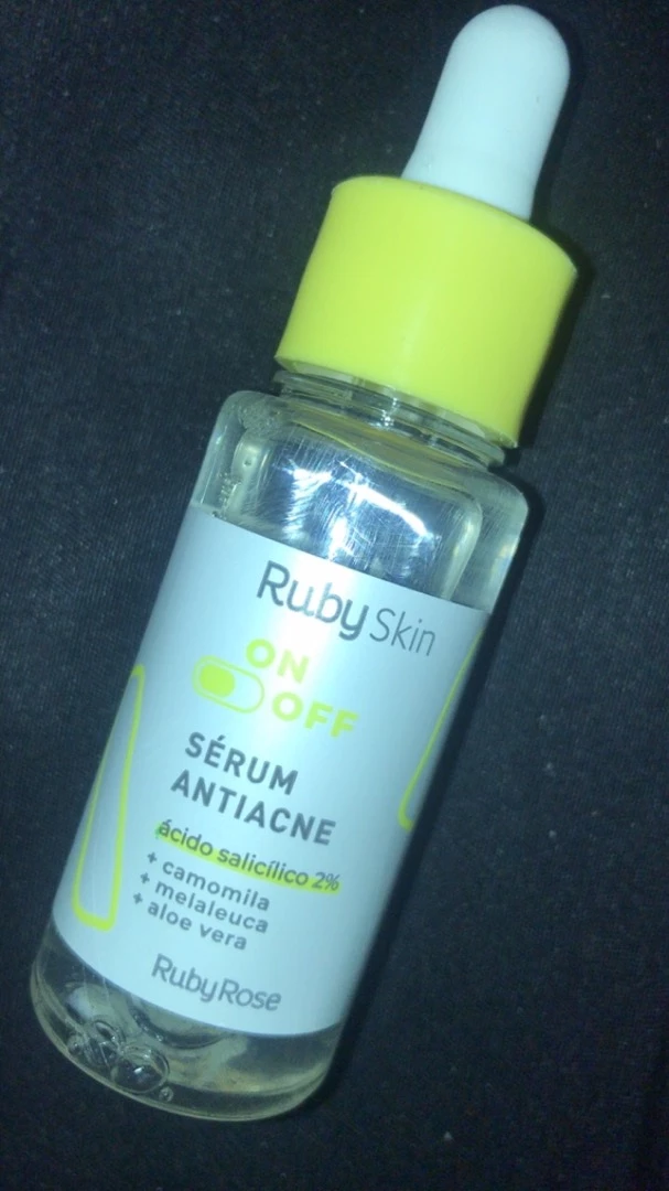 O Sérum Antiacne On Off Ruby Skin contém ácido salícilico melaleuca camomila e aloe vera promove intensa hidratação e revitalização possui ação suavizante calmante protetora e auxilia no controle de oleosidade estimula a renovação e fortalece a barreira natural da pele Livre de óleo mineral silicones e parabenos