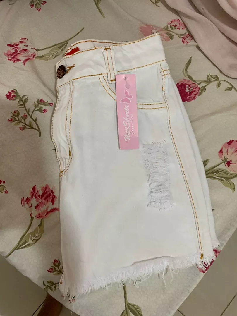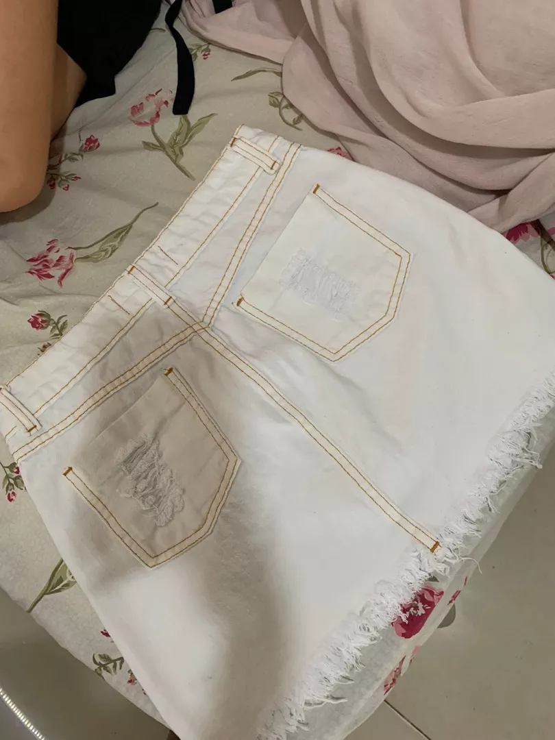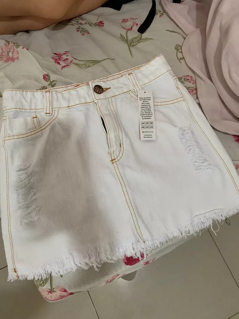Saia Jeans Luxo Feminina Cintura Alta Detonada Hot Pants Destroyed Cós Alto Empina Bum Bum Off White