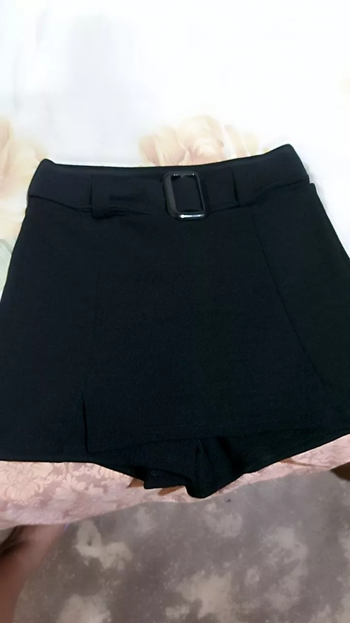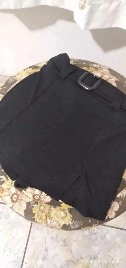 Saia Feminina Liso Curto Com Fivela e Cinto Fake em Crepe de Malha - S.A PRETO LISO