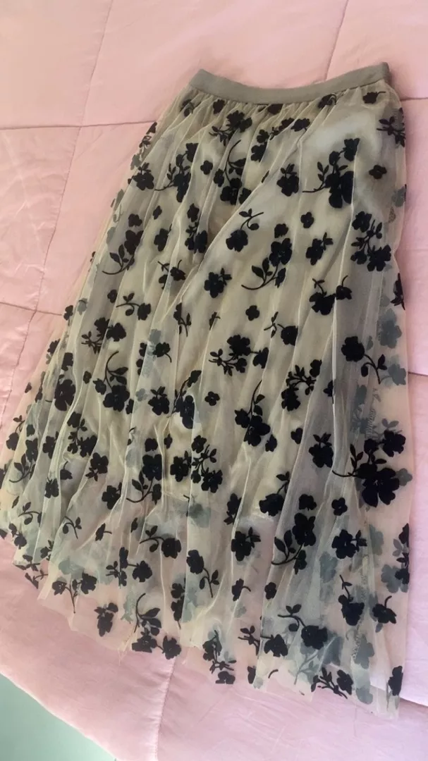 Esta saia tem 3 camadas 2 camadas de tule 1 forro A primeira camada de tule com flores de penugem costuradas