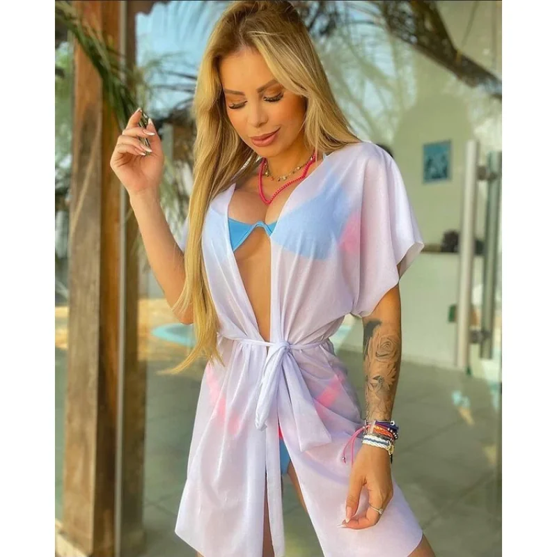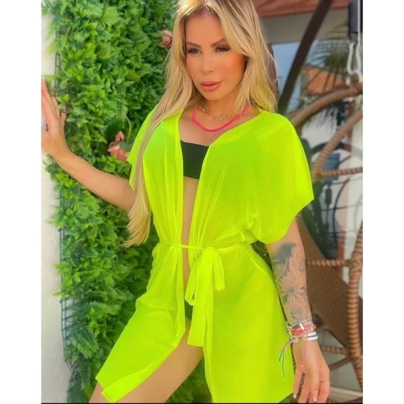 O Kimono de Amarrar Saida de Praia Curta é perfeito para aproveitar os dias ensolarados. Feito com tecido que seca rapidamente, proporciona conforto e praticidade. Com seu design versátil e amarração ajustável, pode ser usado como saída de praia ou como peça casual em looks do dia a dia. Garanta já o seu e esteja sempre pronta para arrasar!