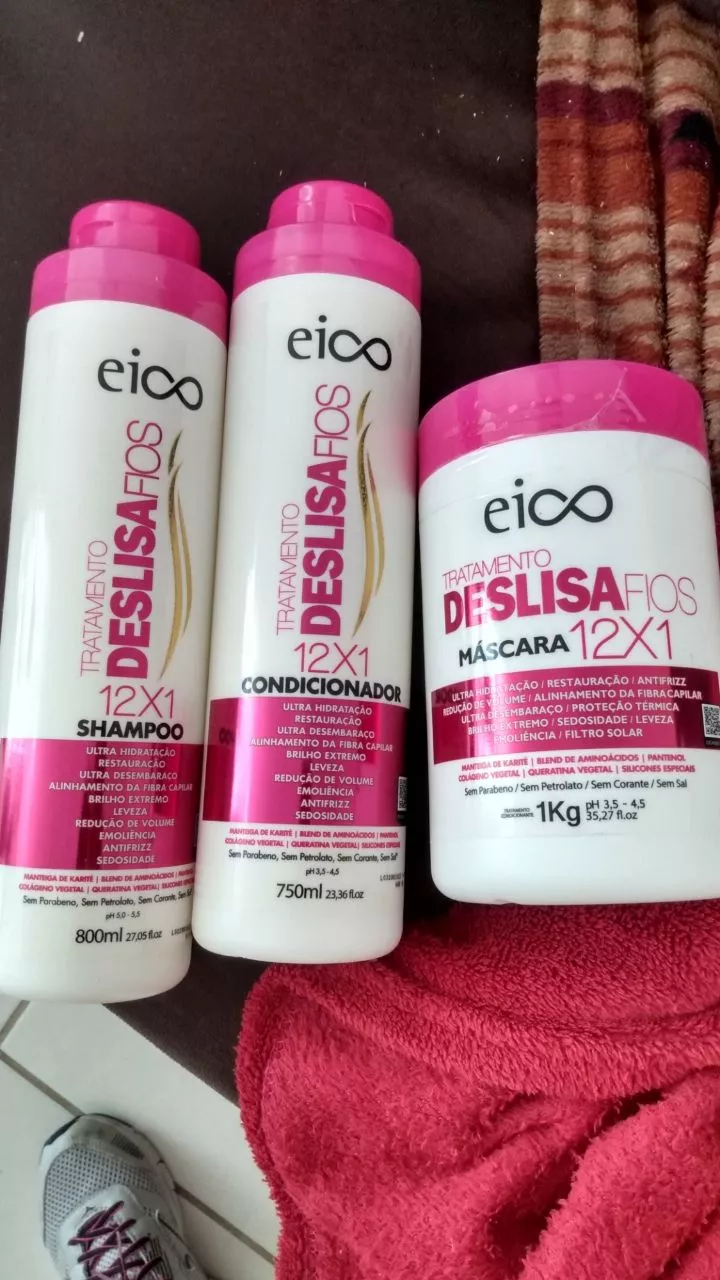 Shampoo Aplique o produto sobre o cabelo úmido e massageie suavemente Enxágue em abundância e repita a operação Para um melhor resultado utilize a linha completa EICO Tratamento Deslisa Fios 12x1