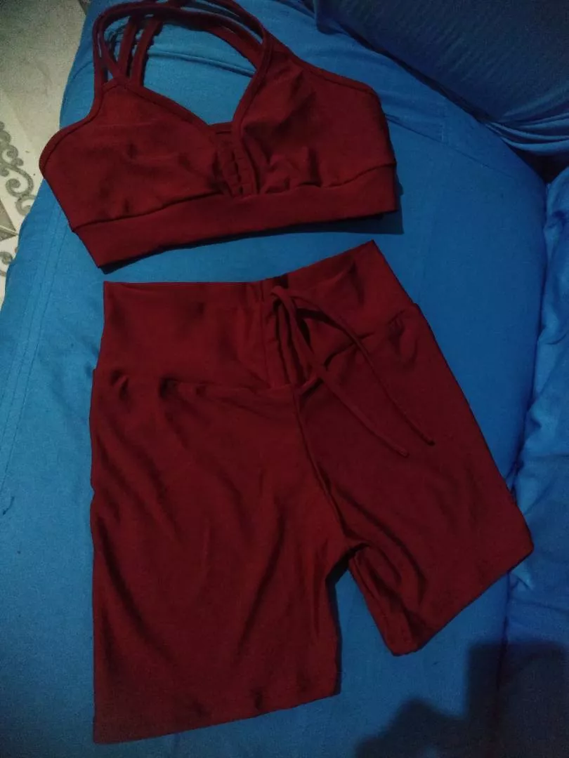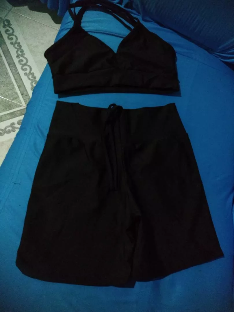Conjunto com Short com cordão para regulagem e top de alça como mostram as fotos