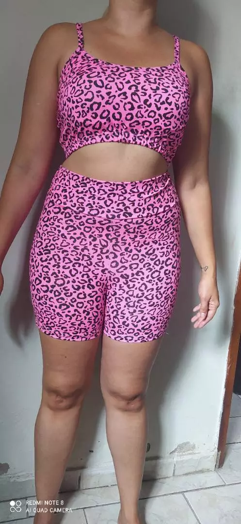 Top de alcinha cruzada sem bojo com Conjunto Fitness short - onça tradicional grande