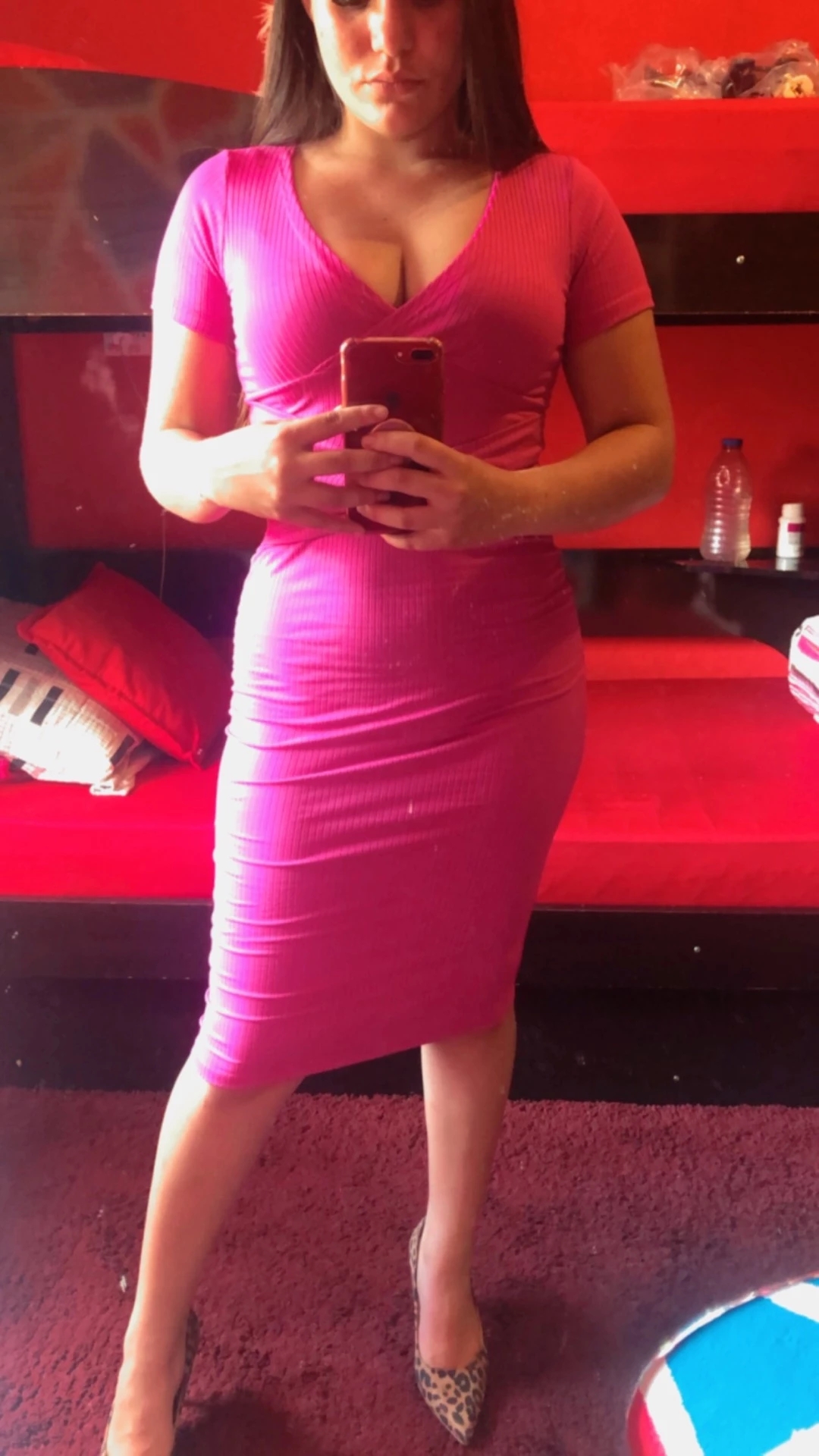 Transpassado na cintura, vestido mídi manga curta - Fúcsia