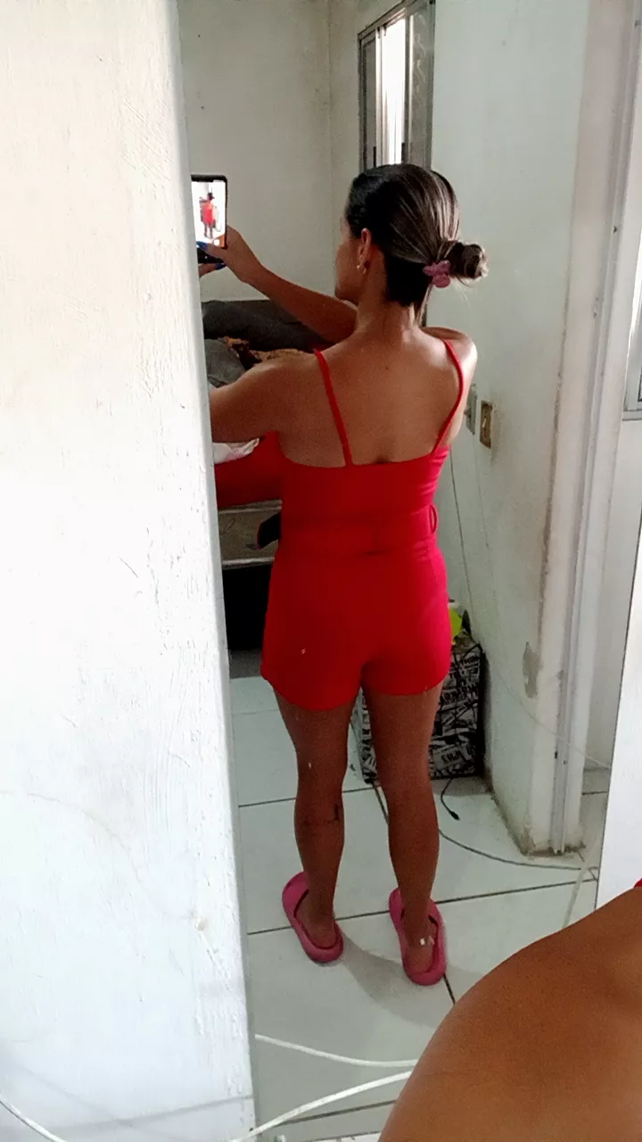 Fotos reais do produto modelo usa tamanho 34 está vestindo tamanho P