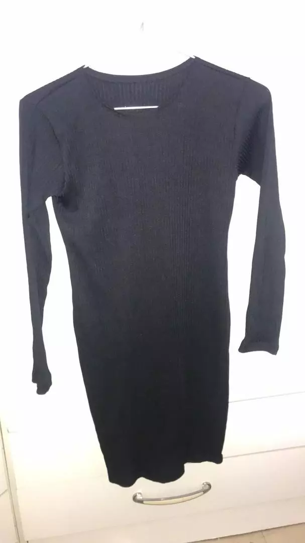 Vestido curto de malha canelada, modelo tubinho, com gola rasa e manga longa - moda feminina - P