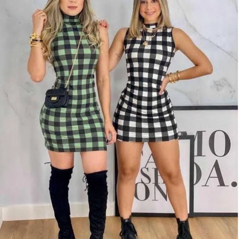 Compre o Vestido curto feminino gola alta xadrez manga cavada em malha canelada na loja online de roupas Raryel. Aproveite nossos preços baixos, promoções e descontos!