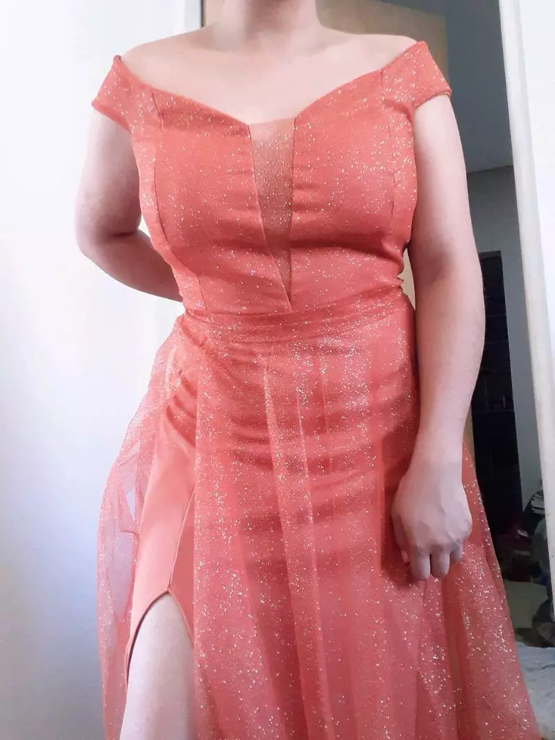 Vestido ombro a ombro com brilho e tule para festa, casamento ou formatura - Terracota