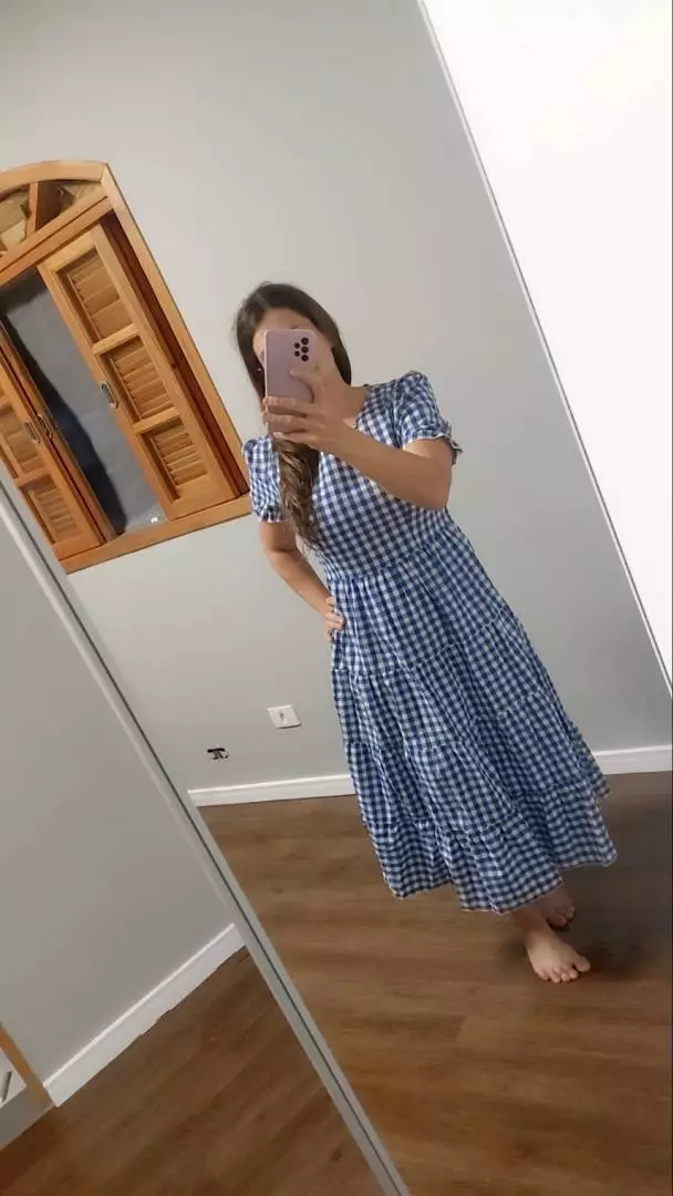 Vestido Plissado Xadrez Casual Midi Azul - Lovito - Azul